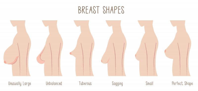 上圖依序中文的表達為:木瓜奶、大小不均型、胸部變型、下垂型、發育不全型、完美胸型等六種!